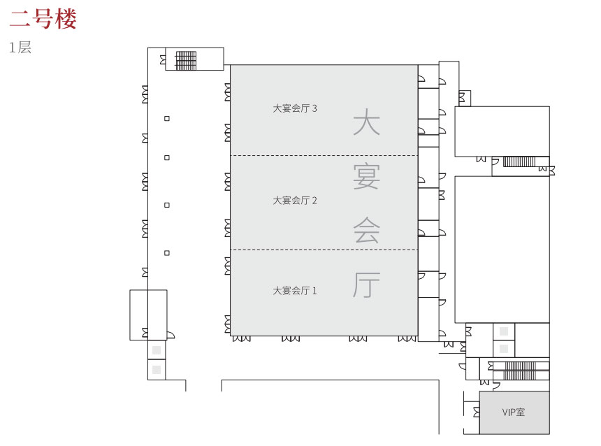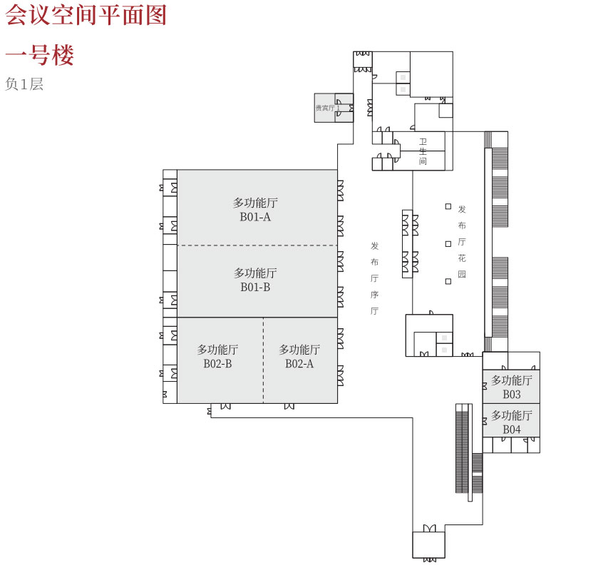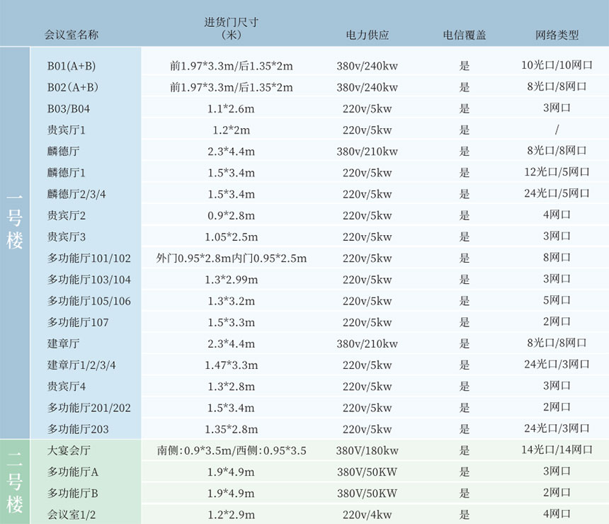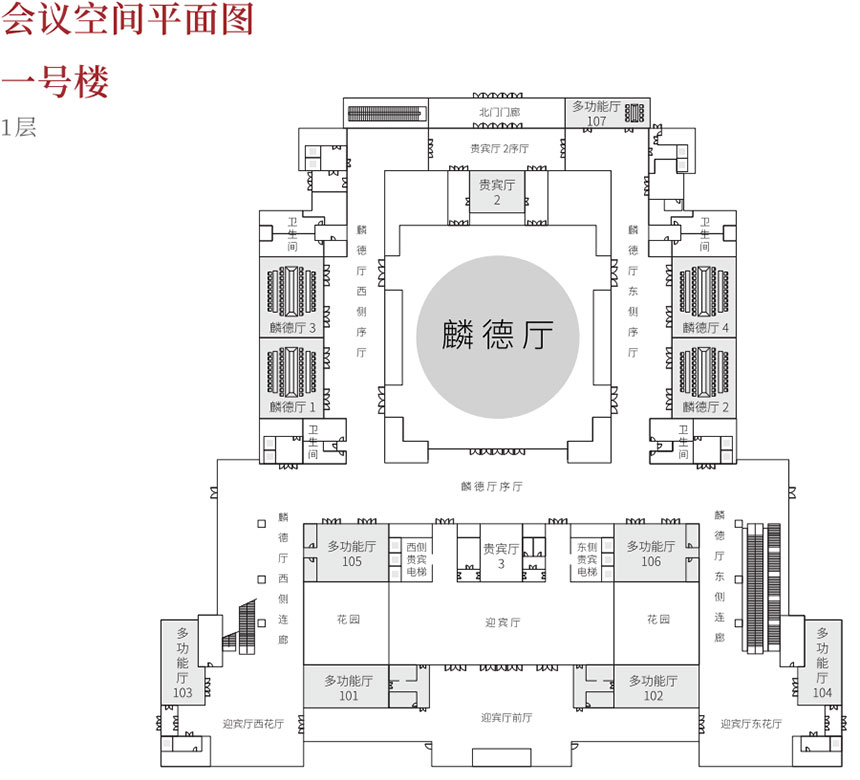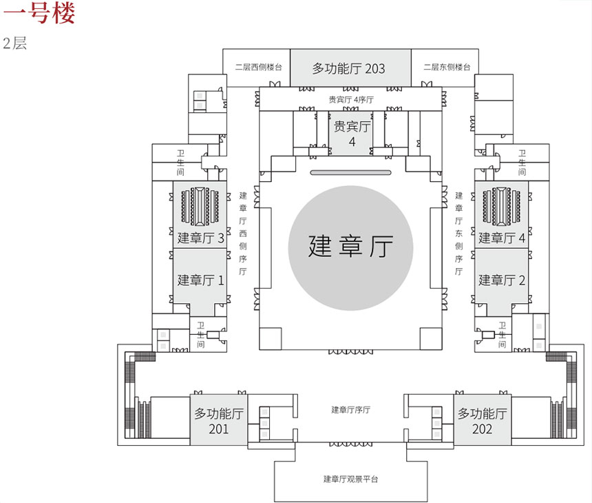 会议中心1号楼作为高端国际峰会主会场,参照北京雁西湖国际会议中心设计建造,主体建筑地上两层,地下一层,局部设置为设备夹层。主体功能为地下一层新闻发布厅、一层麟德厅、二层建章厅,层高分别为:地下一层6.15米,一层9米,二层穹顶最高点18米,最低点8米,同时也是西北地区最大的圆桌会议厅。